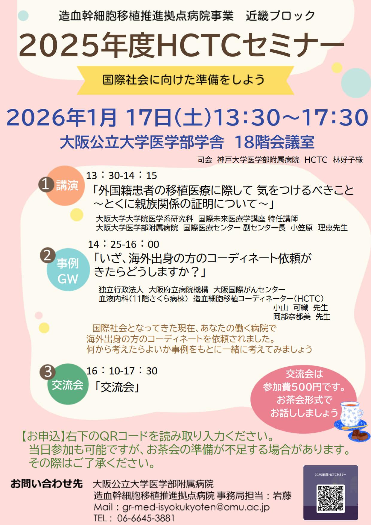 【2026/1/17】2025年度HCTCセミナー開催します [投稿日] 2025年11月12日2026年01月06日 2025年度HCTCセミナー 「国際社会に向けた準備をしよう」を開催いたします。 日時:1/17(土)13:30-17:30 場所:大阪公立大学大学院医学研究科 18階 会議室 1.外国籍患者の移植医… ポスター 詳細はこちら