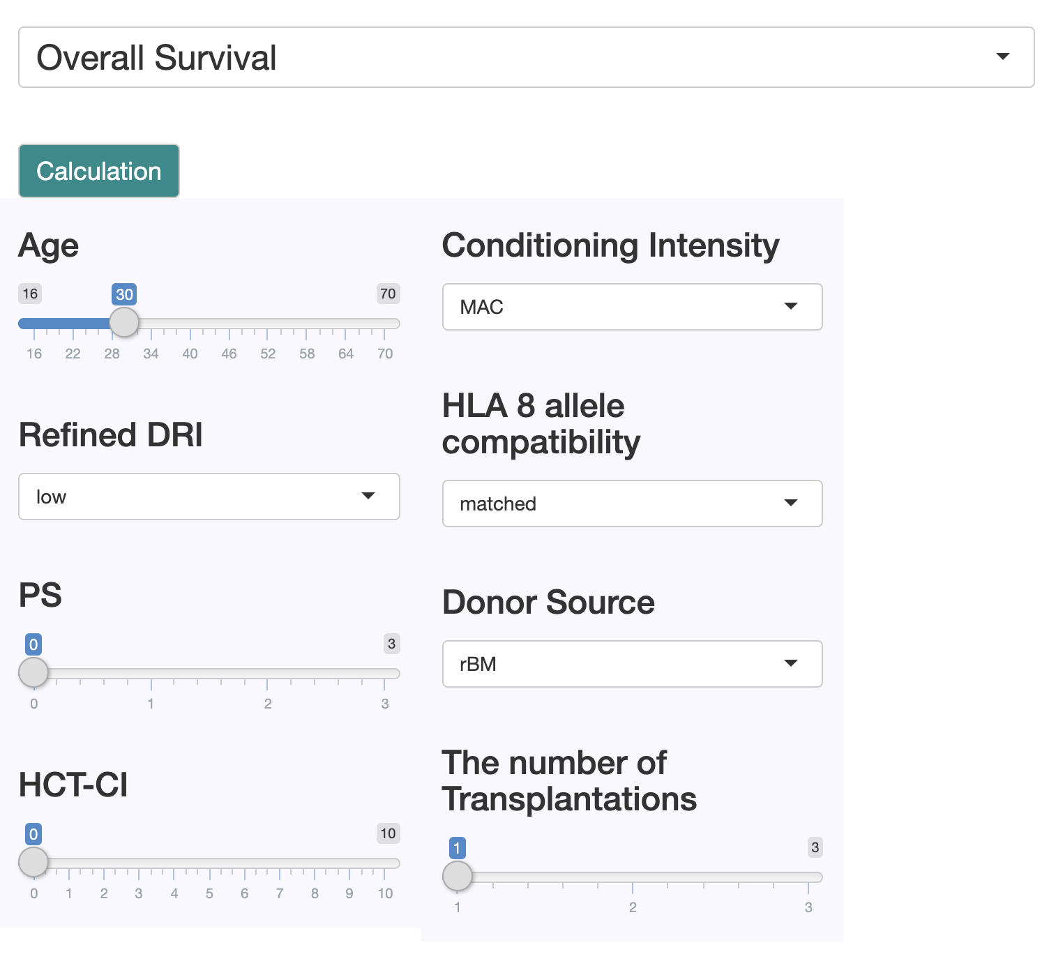 これから同種造血細胞移植予定の患者様の身体、疾患、移植法などの情報を設定することで、過去当院で同条件の患者様が移植を行った場合の移植予後が計算され、表示されるアプリケーションです。
