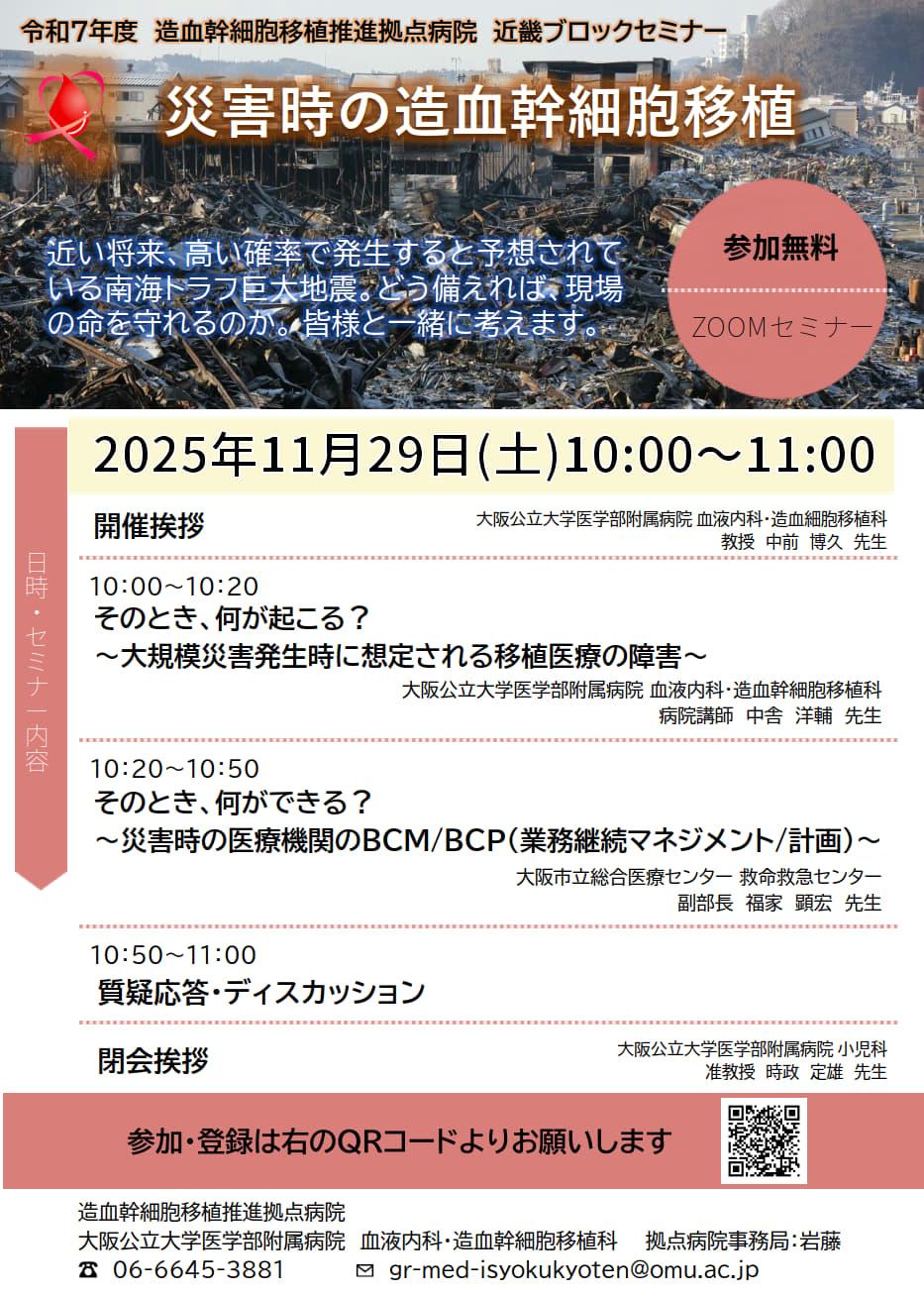 【11/29(土)10:00-11:00】 災害時の造血幹細胞移植 セミナー開催のお知らせ [投稿日] 2025年09月30日 2025年11月29日(土)10:00-11:00 WEB開催にて「災害時の造血幹細胞移植」セミナーを開催します 1.そのとき何が起こる?~大規模災害発生時に想定される移植医療の障害~ ポスター 詳細はこちら