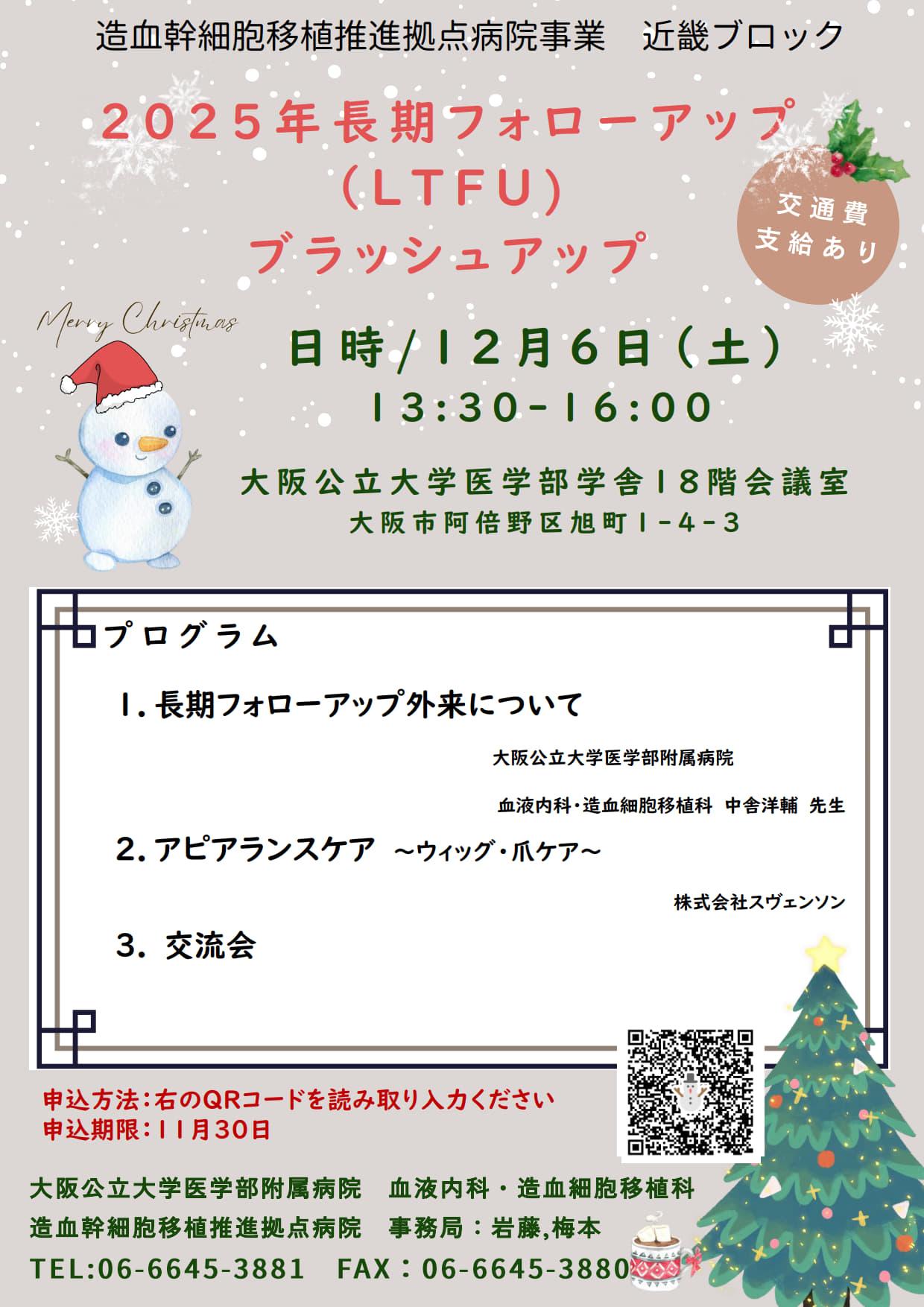【12/6(土)】LTFUブラッシュアップセミナー開催のお知らせ [投稿日] 2025年10月03日 日時:2025年12月6日(土)13:30-16:00 場所:大阪公立大学大学院医学研究科 18階会議室 LTFU(長期フォローアップ)看護師のブラッシュアップを目的に セミナーと交流会を実施いたしま… ポスター 詳細はこちら