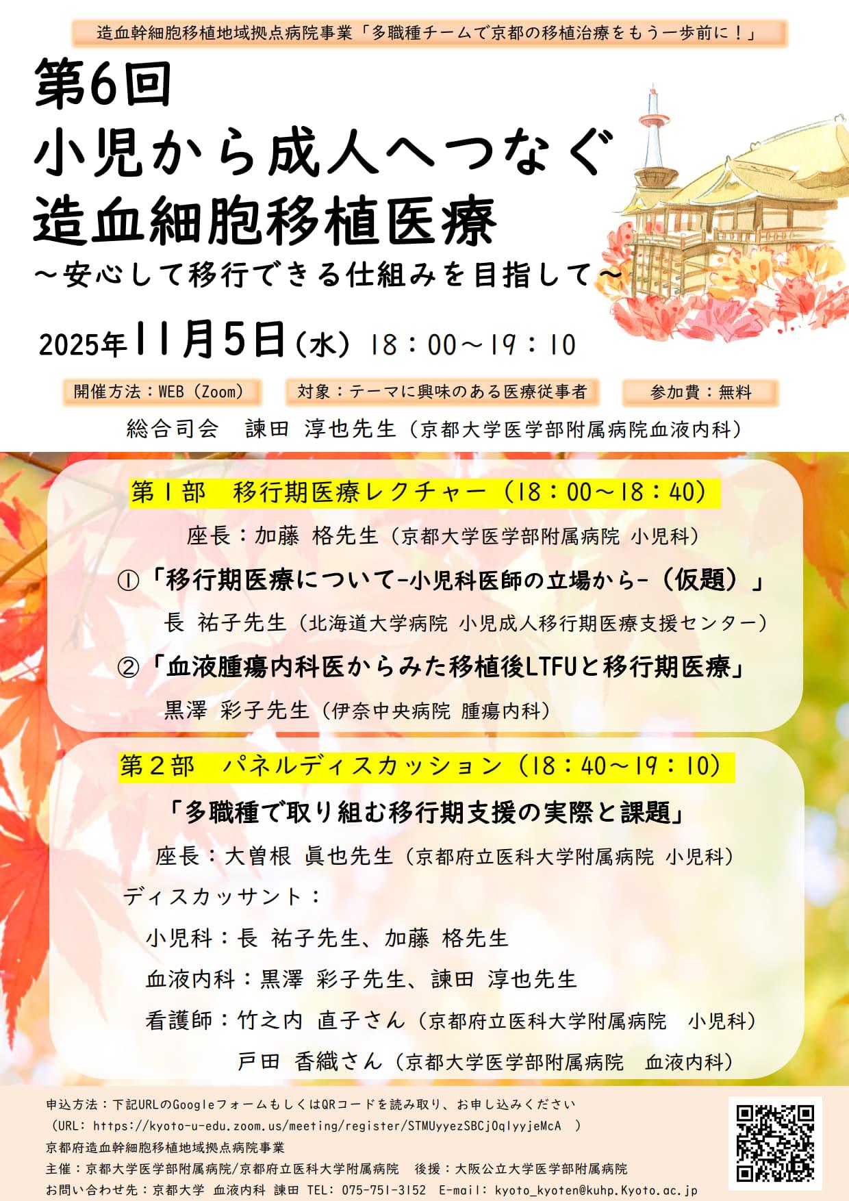 【11/5】小児から成人へつなぐ造血細胞移植医療~安心して移行できる仕組みを目指して~開催のお知らせ [投稿日] 2025年10月03日 2025年11月5日(水)18:00-19:00 多職種チームで京都の移植治療をもう一歩前に! 「小児から成人へつなぐ造血細… ポスター 詳細はこちら