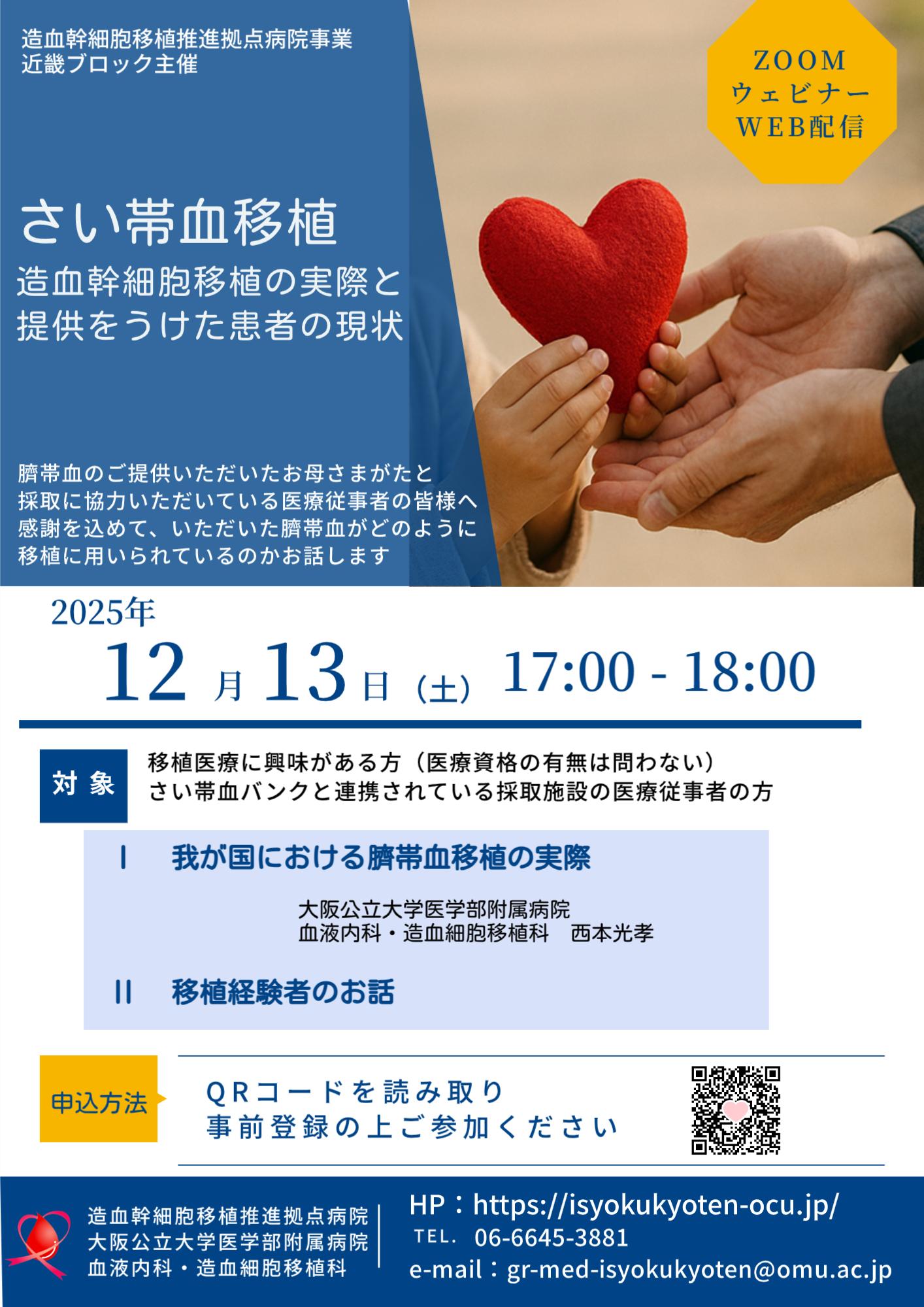 【12/13(土)WEB17:00-18:00】さい帯血移植セミナーを開催します [投稿日] 2025年10月03日 日時:2025年12月13日(土)17:00-18:00 開催方法:WEB(ZOOM)での開催 「臍帯血移植 造血幹細胞移植の実際と提供を受けた患者の現状」 1.我が国におけるさい帯血移植の実際 2.… ポスター 詳細はこちら