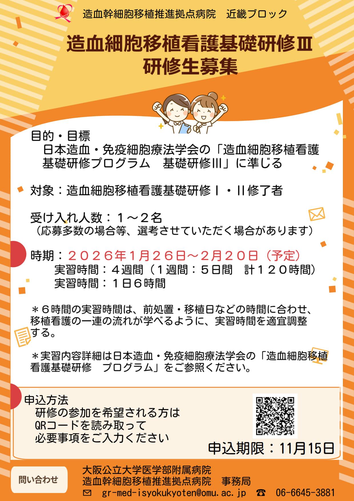 2025年度看護基礎研修Ⅲ(見学研修)の募集を行います(11/15まで) [投稿日] 2025年10月21日 造血細胞移植看護基礎研修Ⅲを2026年1/26-2/20に実施を予定しております。 対象は ・移植件数が少なく移植経験が少ないまたは、経験のない看護師 ・看護師経験3年以上 ・看護基礎研修Ⅰ・Ⅱ修了証… ポスター 詳細はこちら